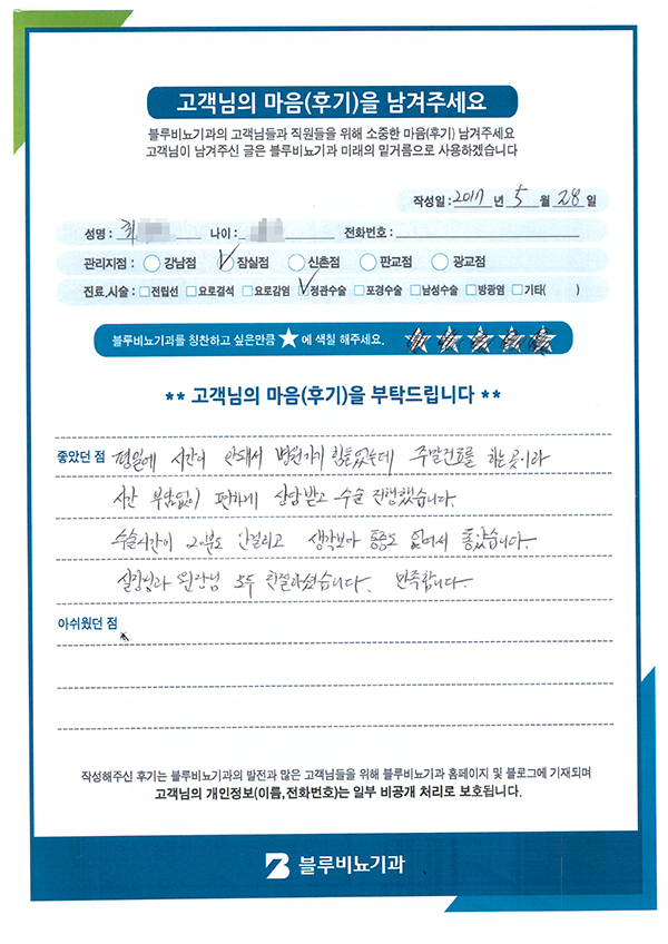 평일에 시간이 안돼서 병원가기 힘들었는데 주말진료를 하는 곳이라 시간 부담없이 편하게 상담받고 수술 진행했습니다.