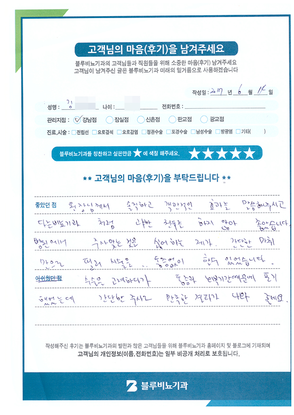 원장님께서 솔직하고 객관적인 효과를 말씀해주시고 다른 비뇨기과처럼 과한 권유를 하지 않아 좋았습니다.